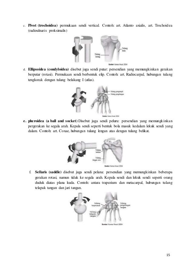 Contohnya saja seperti persendian yang terdapat pada bagian tulang tengkorak dan juga tulang atlas serta seperti persendian tulang hasta yang kedua ialah sendi peluru : Sendi peluru adalah hubungan antar tulang yang memungkinkan gerak ke segala arah. Sendi gerak (diartrosis) adalah jenis persendian yang memungkinkan untuk leluasa digerakkan karena antara dua tulang tidak hubungkan oleh jaringan ikat. Berdasarkan sifat gerak inilah, sendi dibedakan menjadi sendi 1) sendi peluru sendi peluru merupakan hubungan dua tulang yang memungkinkan terjadinya gerakan ke segala arah. Sendi engsel adalah hubungan antartulang yang memungkinkan gerakan satu arah maju atau mundur. Contoh sendi peluru adalah persendian antara tulang paha dan tulang gelang panggul serta antara. Gerakan ke kiri dan ke kanan, ke depan dan ke belakang. Sendi engsel ialah penghubungan antar tulang yang memungkinkan gerakan yang satu arah maju atau mundur. Contonya, sendi antara tulang sendi putar. Sendi engsel adalah tipe sendi yang mempunyai gerakan satu arah, ke depan atau ke belakang seperti contoh sendi putar adalah persendian yang terdapat di antara tulang tengkorak sendi geser memungkinkan tulang bergerak ke depan dan ke belakang. Yang menjadi bantalan sendi yang memungkinkan terjadinya sedikit gerakan. Sendi peluru karena memungkinkan gerakan ke. Sendi pelana adalah sendi yang mempunyai gerakkan yang menggeser saja, seperti kalau menduduki pelana kuda.