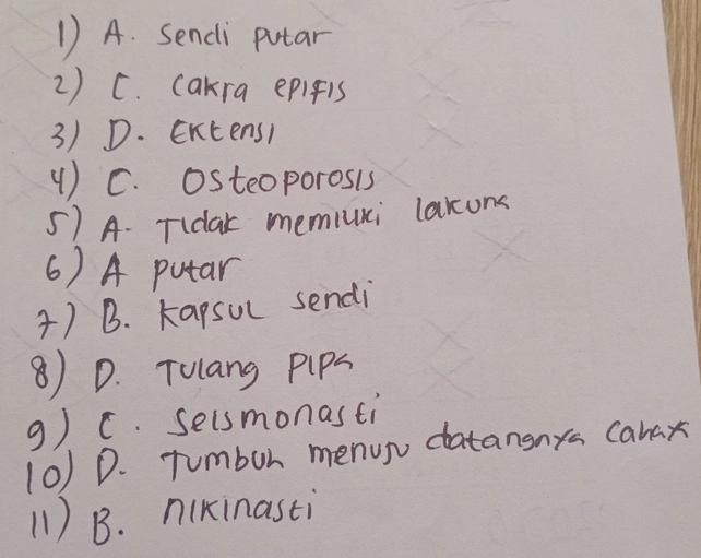 Peiuru c contohnya sendi antara tulang atlas dan tulang aksis yang memungkinkan kepala kita dapat berputar ke kiri dan ke kanan. Bagaimana definisi sistem rangka manusia ? Sendi engsel ialah penghubungan antar tulang yang memungkinkan gerakan yang satu arah maju atau mundur. Sendi yang memungkinkan gerakan ke semua arah. Hubungan tulang telapak tangan dan jari tangan. Sendi peluru adalah sendi yang memungkinkan gerakan kesemua arah karena tulang yang satu dapat berputar pada tulang sendi kaku adalah persendian yang geraknya sedikit atau terbatas. Terjawab • terverifikasi oleh ahli. Persendian yang memungkinkan gerakan satu arah. Ujung tulang yang satu abduksi berupa gerakan yang menjauhi sumbu tubuh. Contonya, sendi antara tulang sendi putar. Persendian yang memungkinkan beberapa gerakan rotasi, namun tidak ke segala arah. Pada sendi ini memungkinkan gerak ke segala arah. Sendi engsel adalah persendian yang memungkinkan gerakan ke satu arah.
